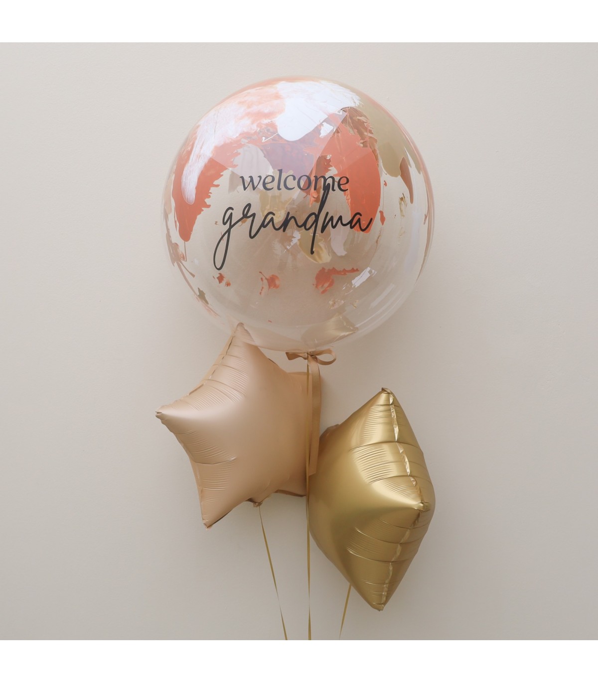 Globo burbuja n24 personalizado con tempera de acrílico con dos estrellas metálicas n18. Inflados con gas helio. Imagen referencial.