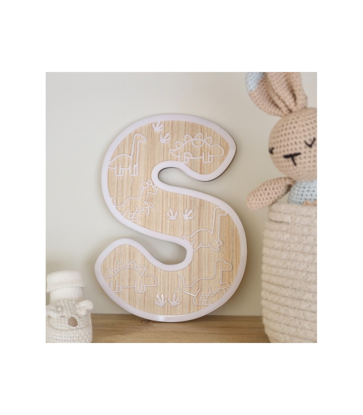 Inicial de acrilico de 26cm de alto decorada con vinil y detalles de acrilico de siluetas de dinosaurios