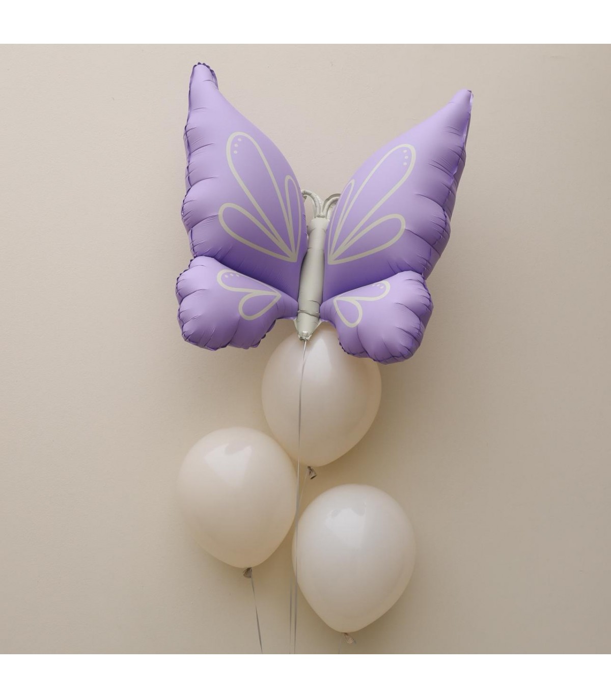 Mariposa morada metálica con tres globos de látex blancos.