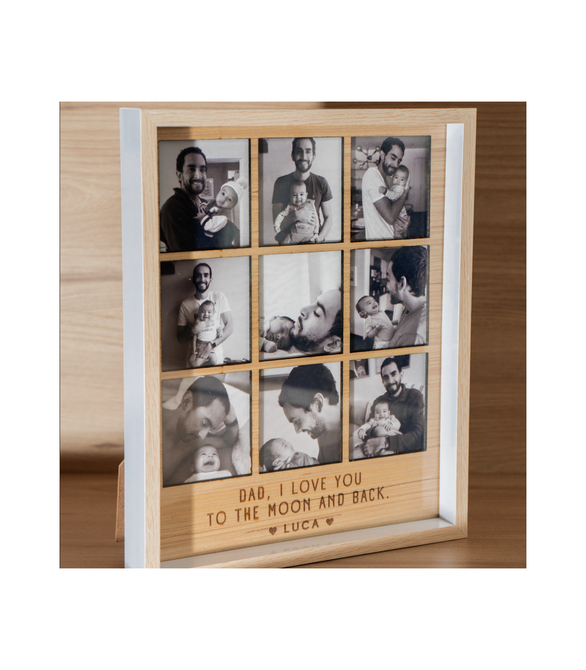 Cuadro de madera 30x22 cm, placa de madera grabada a láser y nueve fotos impresas