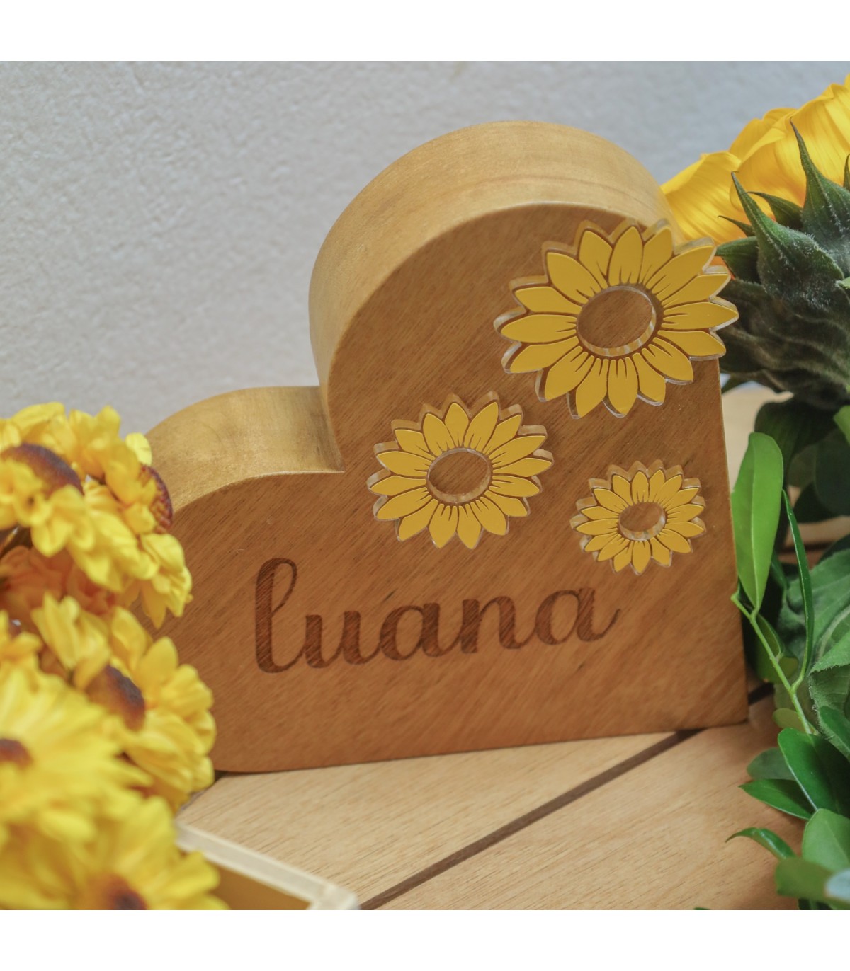 Corazón de madera grabado a láser y tarjeta.