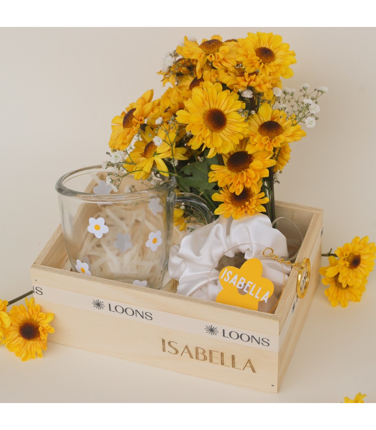 Caja de madera de pino personalizada, taza con diseño de flores en vinil, llavero de acrílico personalizado, scrunchie, ramo de flores y tarjeta. Mix de flores y color de scrunchie según disponibilidad.