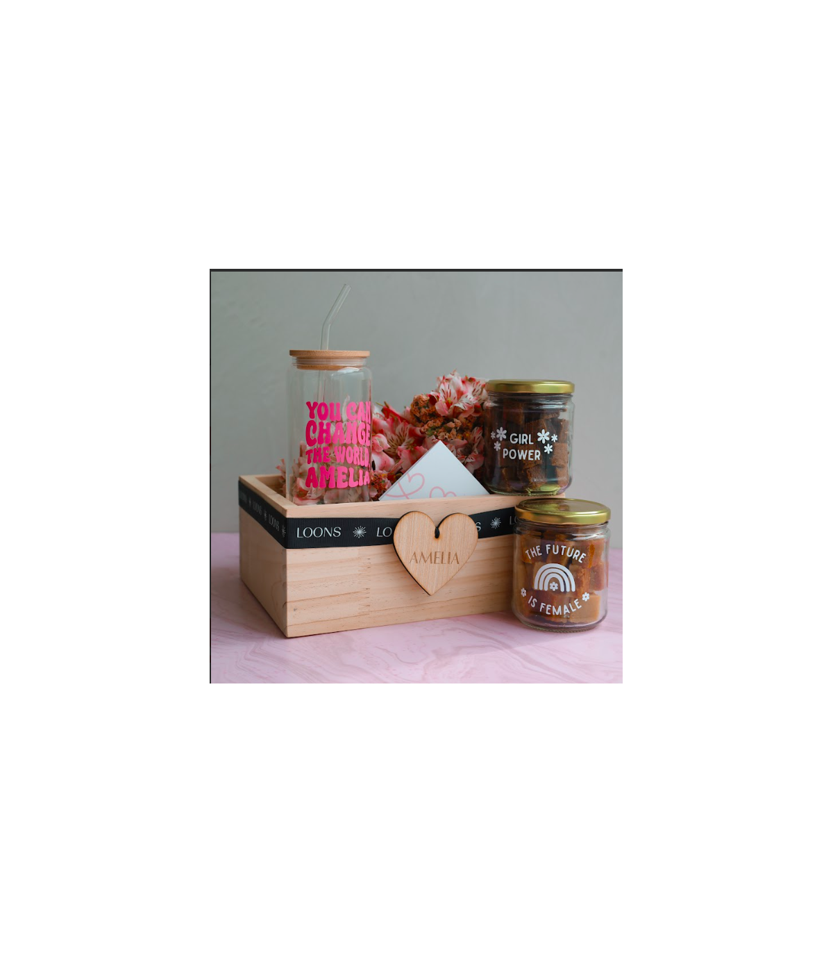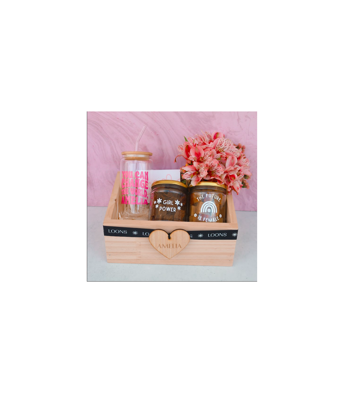 Caja de pino con placa, vaso antiderrame con tapa de bambú personalizado, dos jars rellenos con dulce, un ramo de flores de acuerdo a stock y tarjeta.