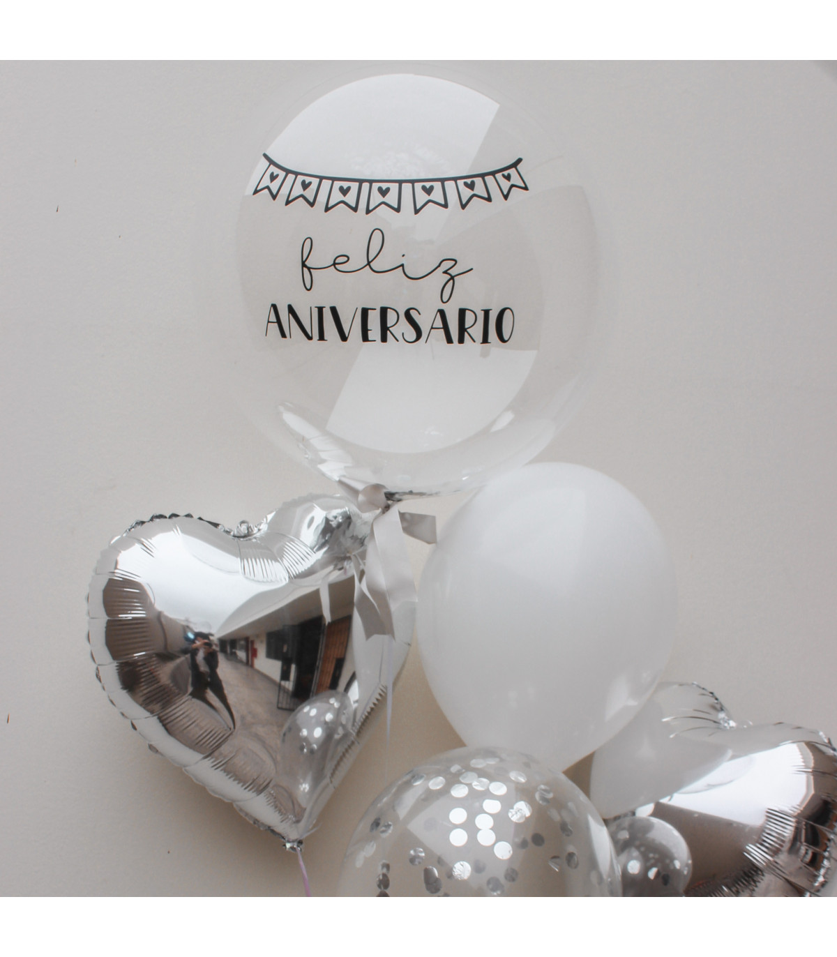 Globo búrbuja 24 pulgadas personalizado , dos corazones metálica 18 pulgadas y dos globos de látex N12. Inflados con gas helio.