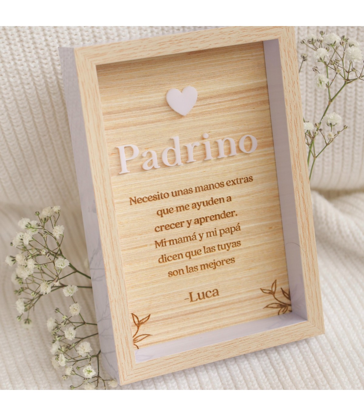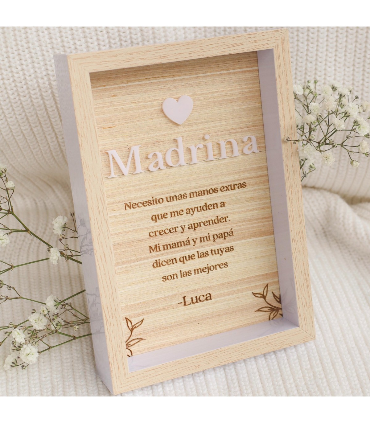 Caja de madera de pino personalizada, cuadro con placa de madera y detalles de acrilico personalizado de 10x15cm y taza personalizada.