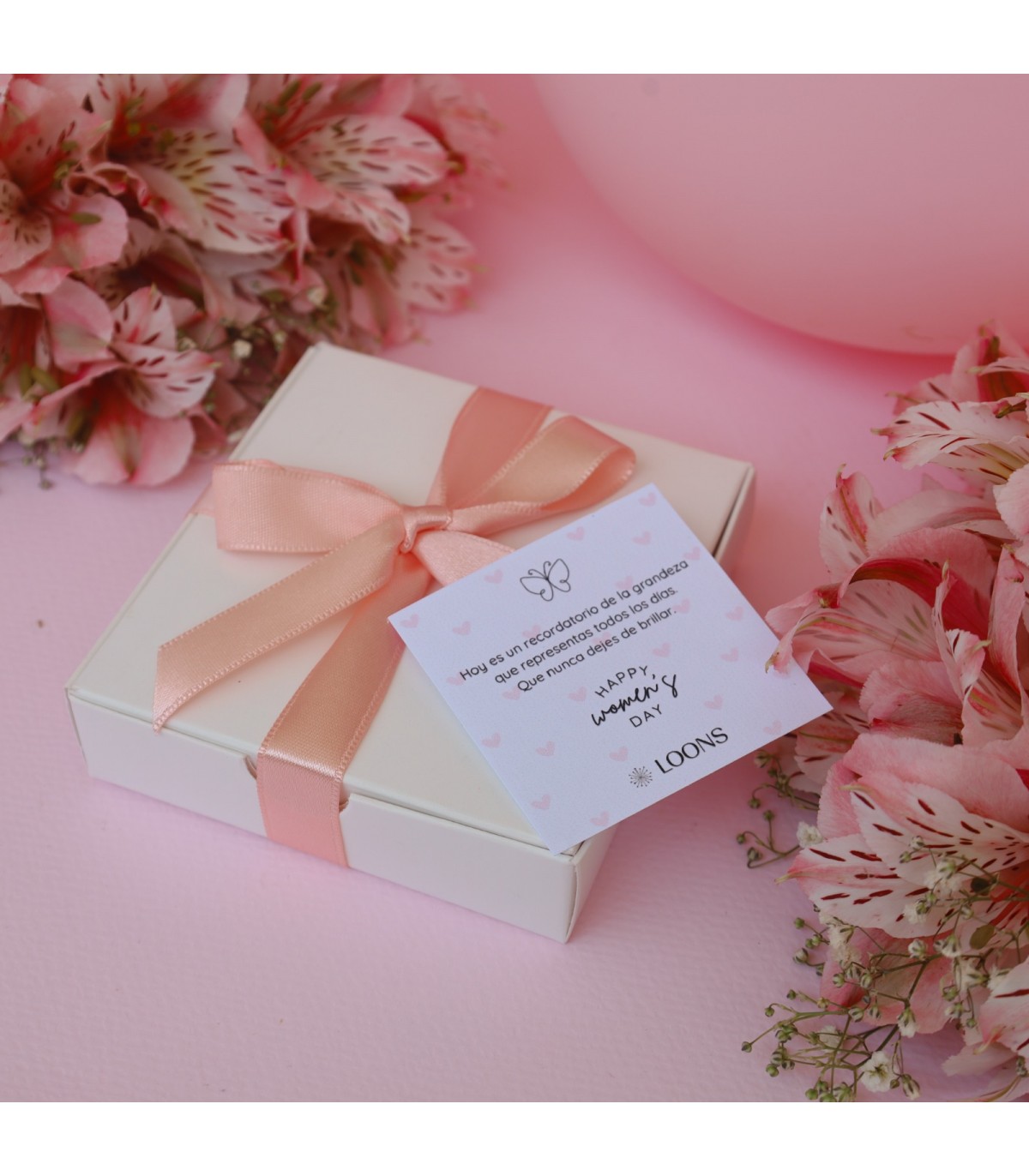Caja de madera de pino personalizada, jar personalizado con jabones de cereza y coco, scrunchie, taza de cerámica, ramo de flores, mini bubble candle y tarjeta. Mix de flores según disponibilidad.