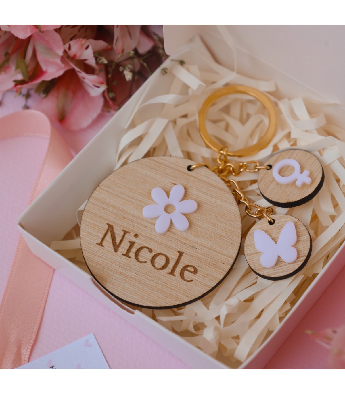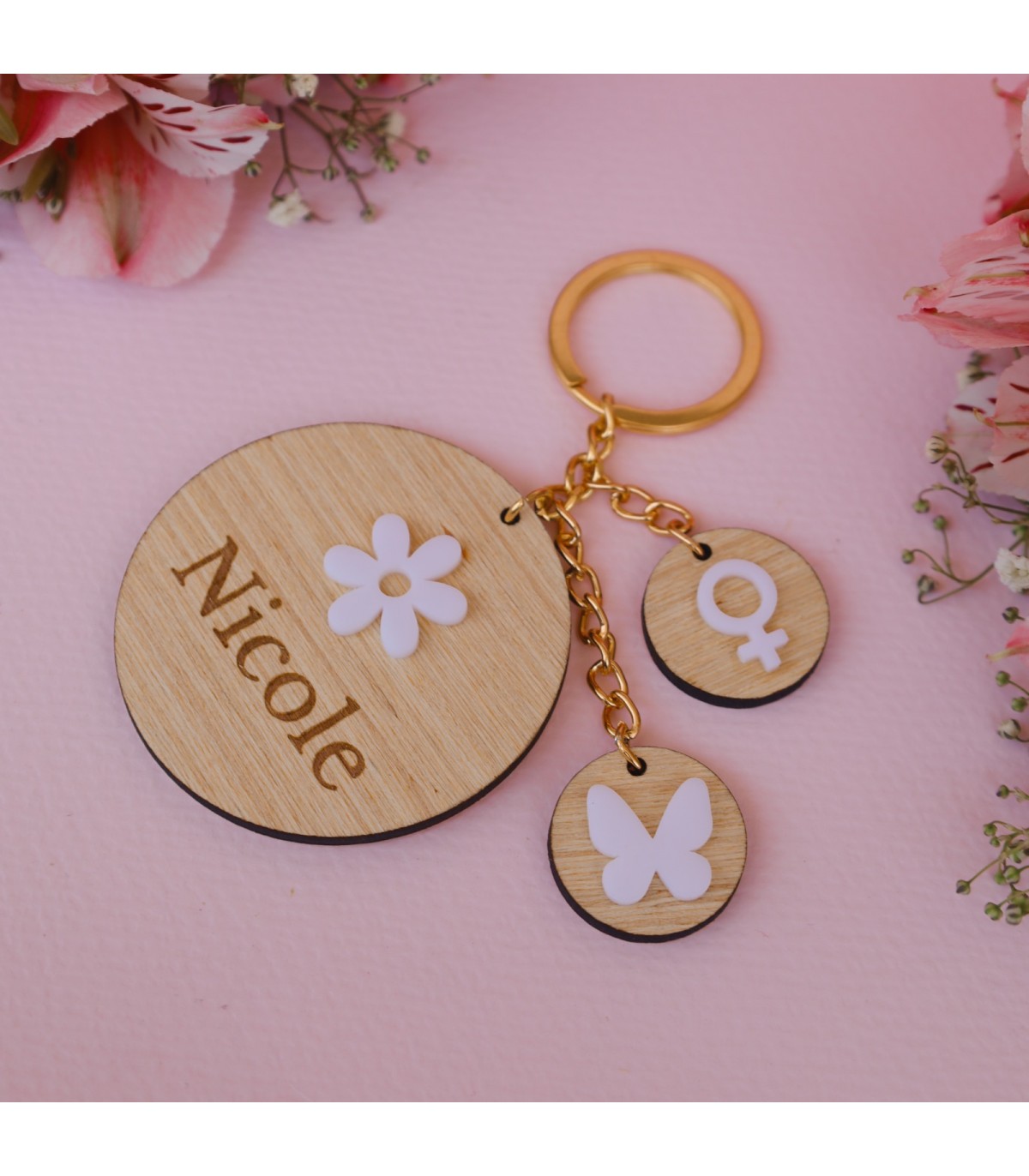 Llavero de madera con detalles de acrílico 5x5cm.